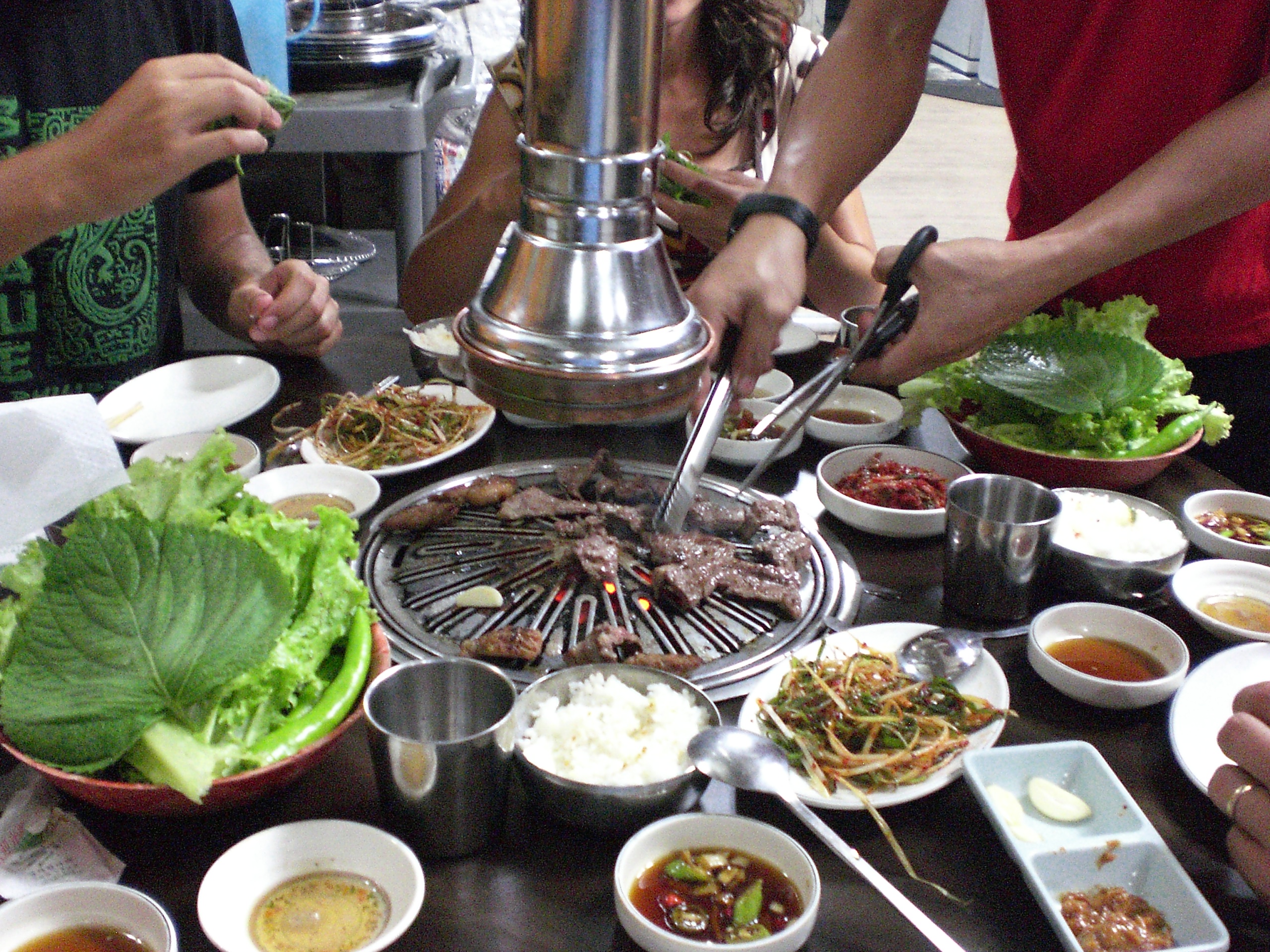 Beim Korean Barbecue schneidet man das Fleisch, das direkt vor einem auf einer heißen Metallplatte mit Geruchsstaubsauger oben drüber gebraten wird – mit einer handelsüblichen Schere.